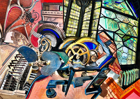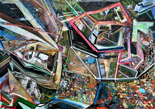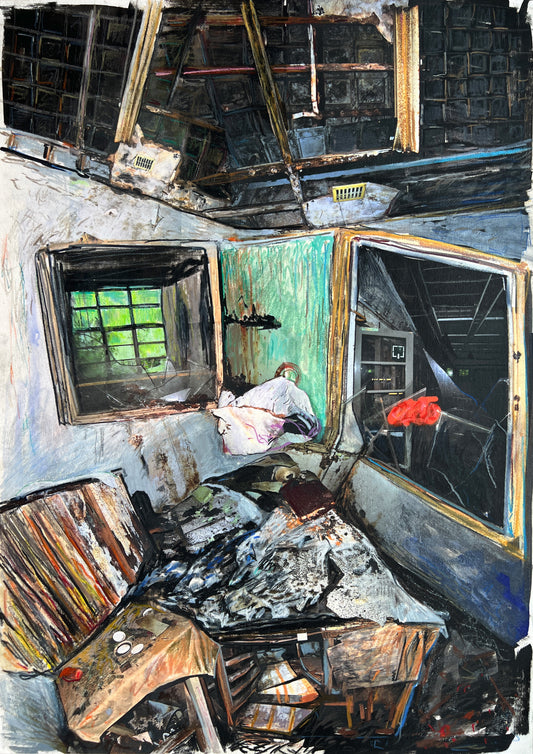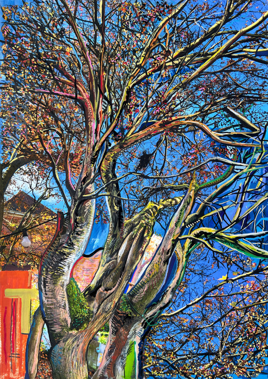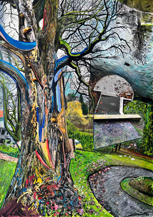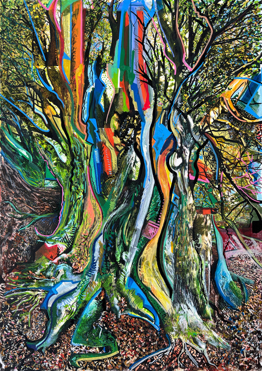 Een origineel kunstwerk op papier met acrylverf, inkten, vetkrijt & kleurpotloden.