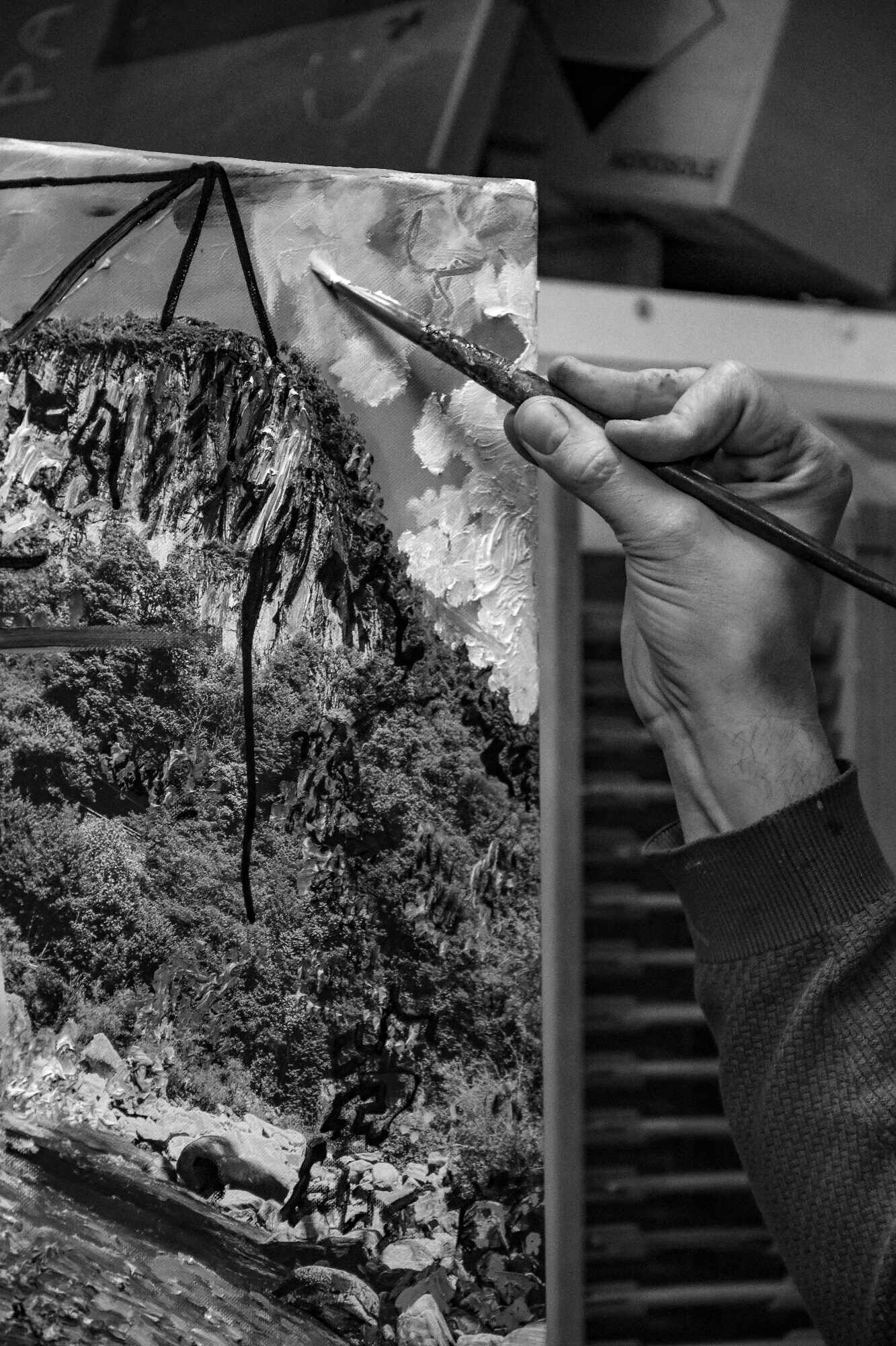 Die fragmentaire fotocollage wordt de compositorische schets waar ik over- en bijschilder tot fotografie en verf elkaar versterken in één glooiend beeld. Het valt meermaals voor dat toeschouwers bij een eerste aanblik er een soort van zoekspelletje van maken. “Wat is foto en wat is schilderij?” Een plezante kennismaking met mijn beeldtaal, maar niet echt de bedoeling. Wat telt is het totaalbeeld, maar evenzeer ook de “totaaltijd” want een collectie van momenten maakt komaf met het bevroren onderwerp dat we weleens herkennen in schilderijen die naar foto zijn geschilderd. Hierdoor duikt er een soort van tijdloosheid op in mijn werk. Geen snapshot vanuit één perspectief, maar een traject van mijn fotografische speurtocht naar visuele snoepjes.