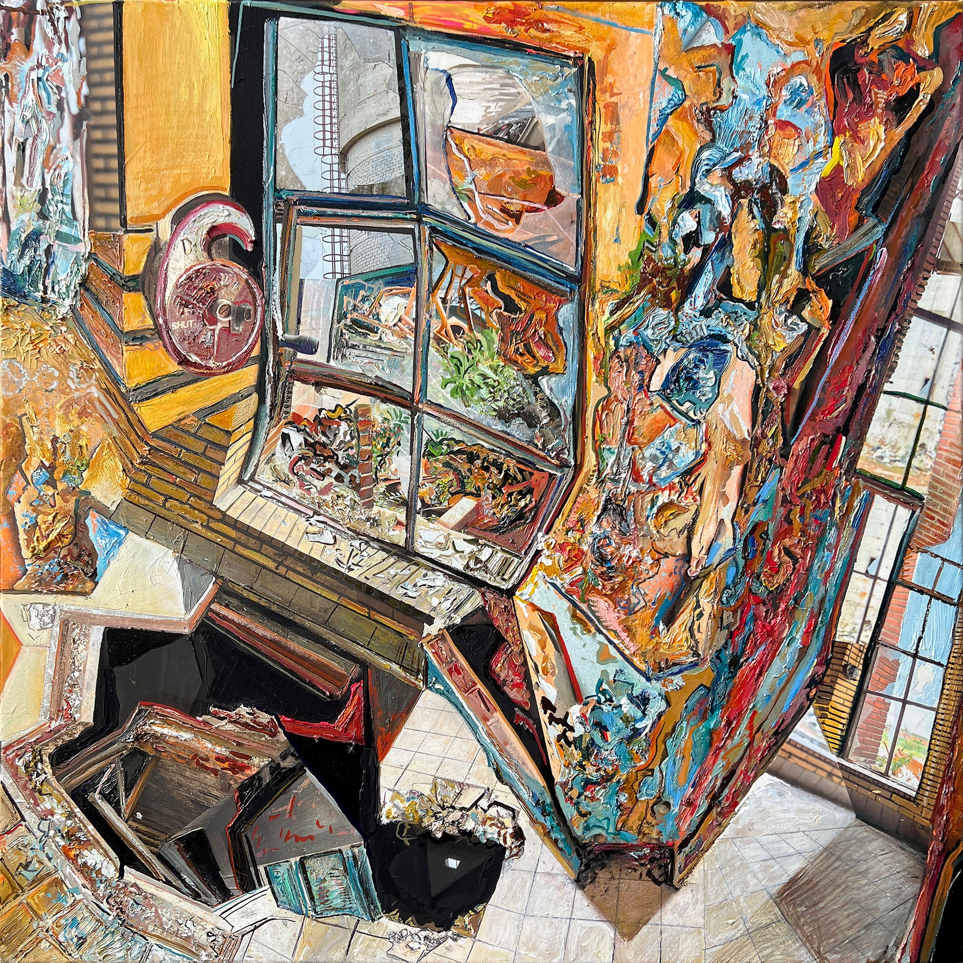 Een toeschouwer kijkt overigens "in" een werk, weg van diens realiteit. In dit geval kijkt men dus in, en meteen weer uit. Wat voor een ademende dynamiek zorgt.